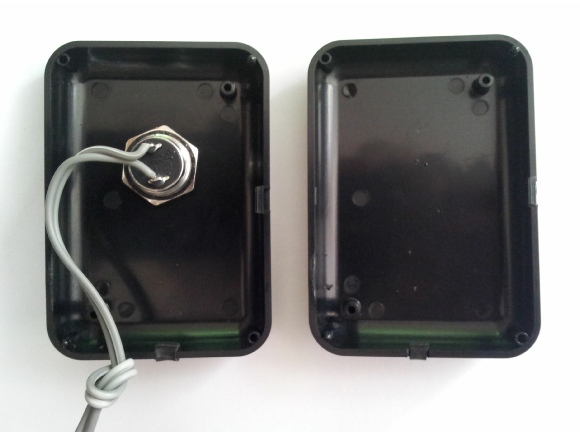 This is one of the five identical ‘buzzer’ buttons opened up showing the very simple wiring to the switch. Note the knot in the wire. This goes inside the box so that heavy-handed users don’t pull the wires off the back of the switch in heated answering moments!