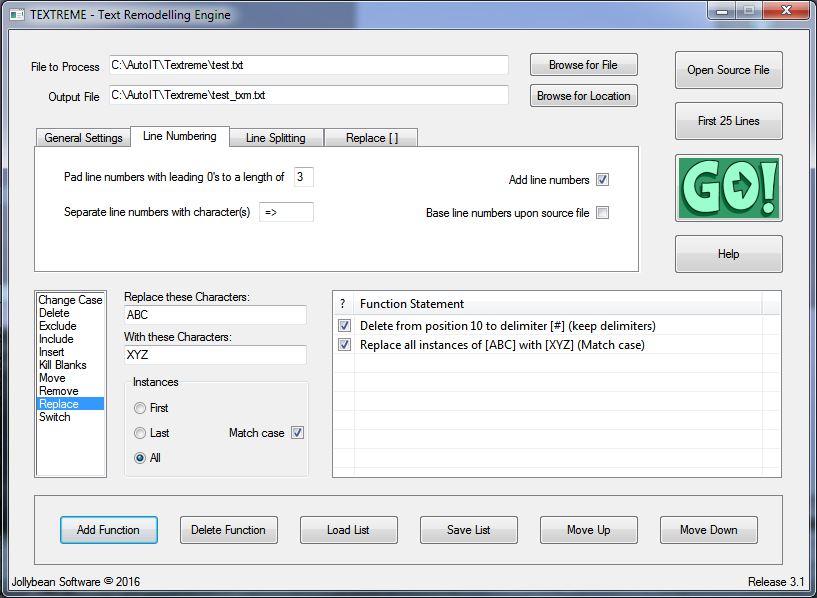 The ten listed actions can be cascaded in a Function List so that many changes can be made in a single pass. You will, of course, have to bear in mind what effect your earlier functions will have upon what the later functions will have left to work with! There is a help file included, but the best advice I can offer is to try it out and see what it can do.