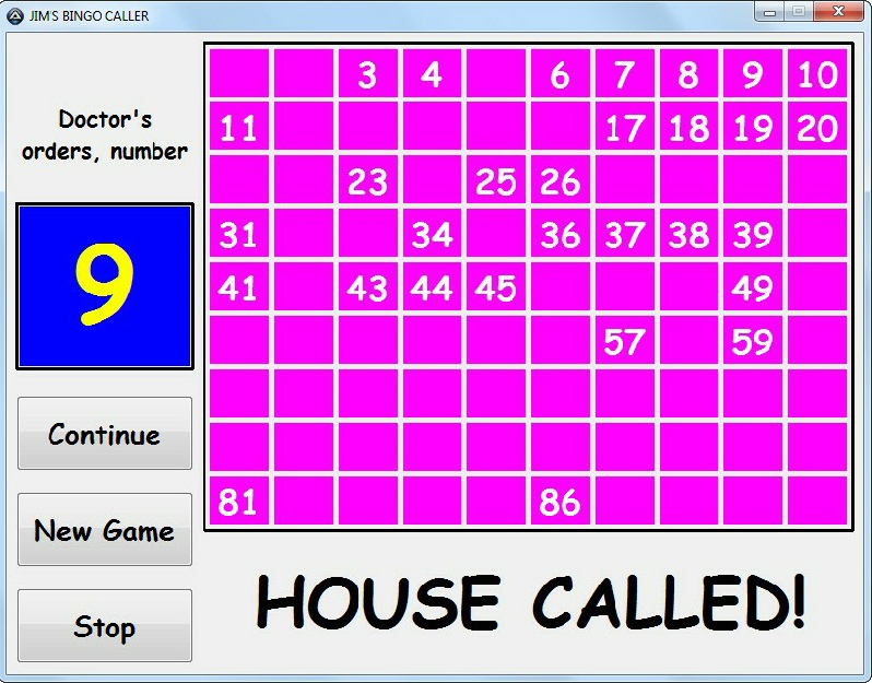 The game ends (or halts) when someone shouts “house!” (or “bingo!”) at which point the number-caller presses the ‘house called’ (Enter) key and then checks the numbers on the shouter’s ticket against the called numbers on the on-screen board. If a mistake has been made then a ‘false call’ is declared and the game continues, otherwise the call is declared valid and the shouter given whatever prize is up for grabs. Sometimes several games are played on the same ticket (such as for one line, two lines then a ‘full house’ - all three lines) so play can continue after a call has been made and verified or a new game commenced from the start.