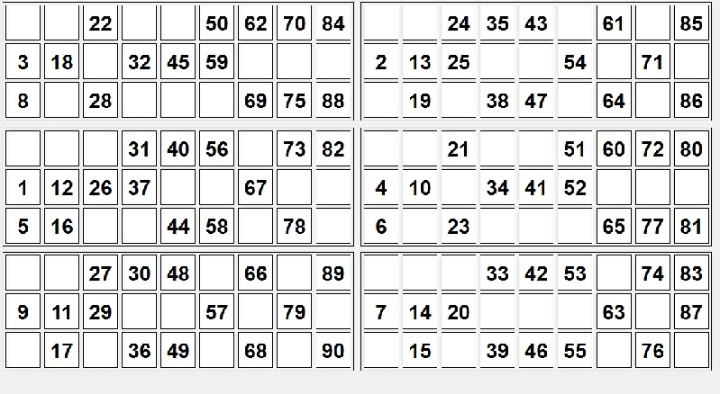Bingo acts as the automatic caller in the classic English game of Bingo (sometimes called ‘housey-housey’). Note that this differs from the USA version by being played using tickets with 3 rows of 5 numbers in a 3 x 9 grid with scattered spaces, and numbers being drawn randomly between 1 and 90. A recent (24/03/2014) facility has been added to create these tickets as an A4 jpg file which are derived from a generated screen-capture. This was not an easy algorithm to implement which is why it has only recently been added. If you think otherwise, bear in mind that each ticket must have 5 numbers per row, each number must be in its correct column, no column is allowed to be empty and each sheet of 6 tickets must contain each number once only. Then give it a try yourself in your language of choice! Alternatively you can use the cards that come with a child’s “Lotto” game, but these will, of course, be the same for each game.